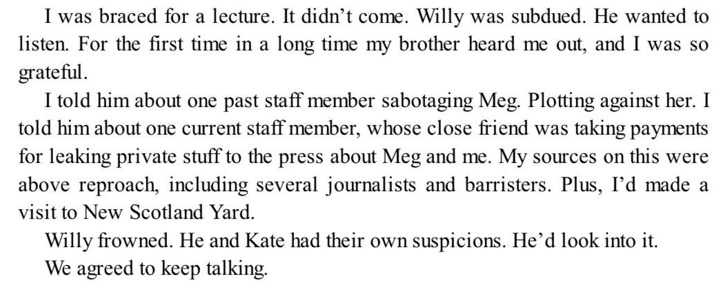 “There on Buckingham Palace–headed paper, was a reply from the Lord Chamberlain at the time, Earl William Peel, who had a particularly close relationship with Charles. The letter included some of the most strong language seen on official household stationery, aimed at Harry, not Jones. ‘It was a threat,’ said a source… [The Lord Chamberlain] said either drop the charges or face severe consequences in twenty-four hours. A message from a lawyer for Jones, arranged by the Palace, soon followed. The decree: stand down from legal action against Prince William’s aide”